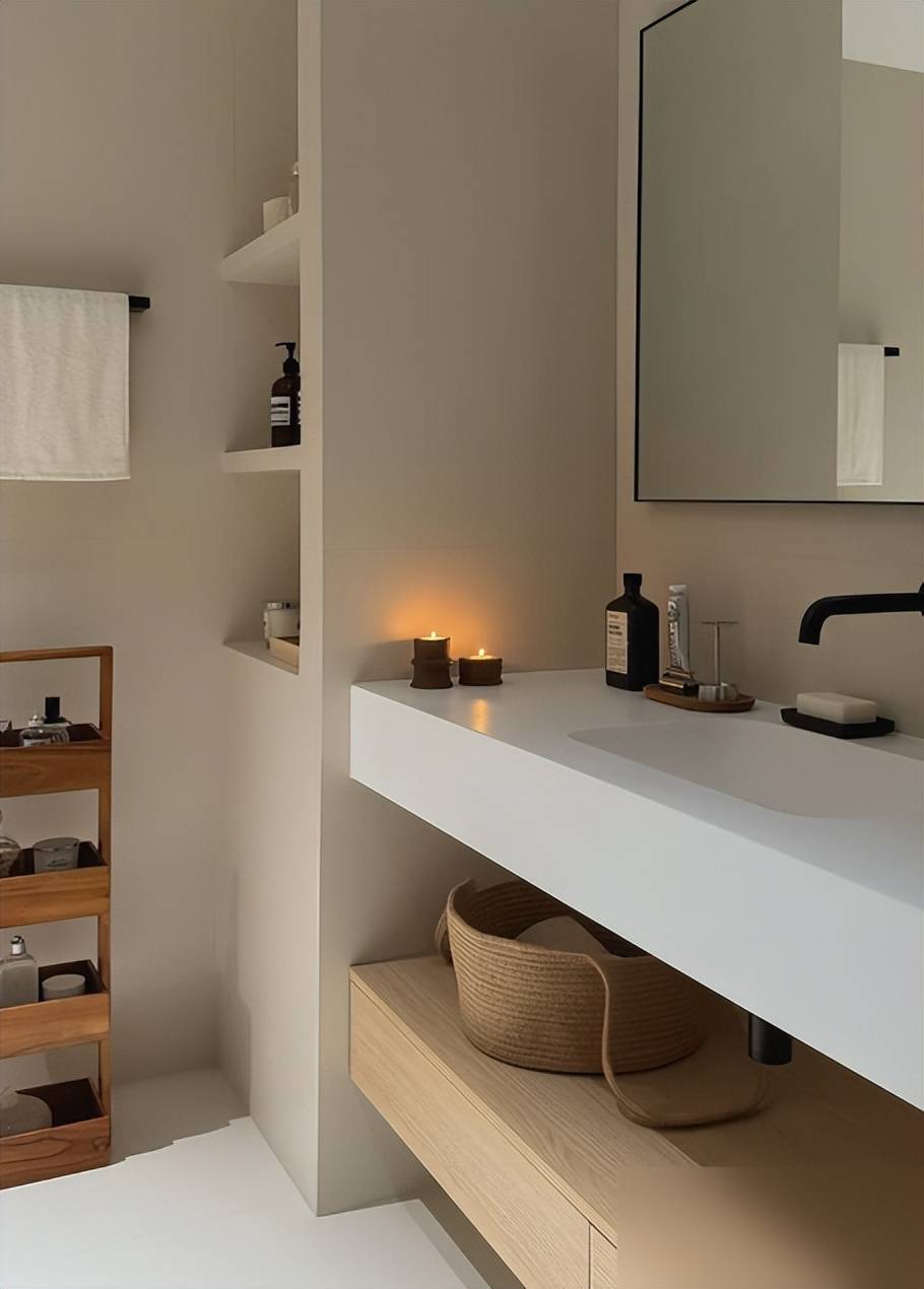 再加上悬空浴室柜,以前落地柜下面藏着头发和积水,擦的时候得蹲在地上抠,现在悬空的,扫地机器人直接钻进去,连死角都能扫干净,下面还能放个收纳篮装拖鞋,是不是比“藏污纳垢”的落地柜香?